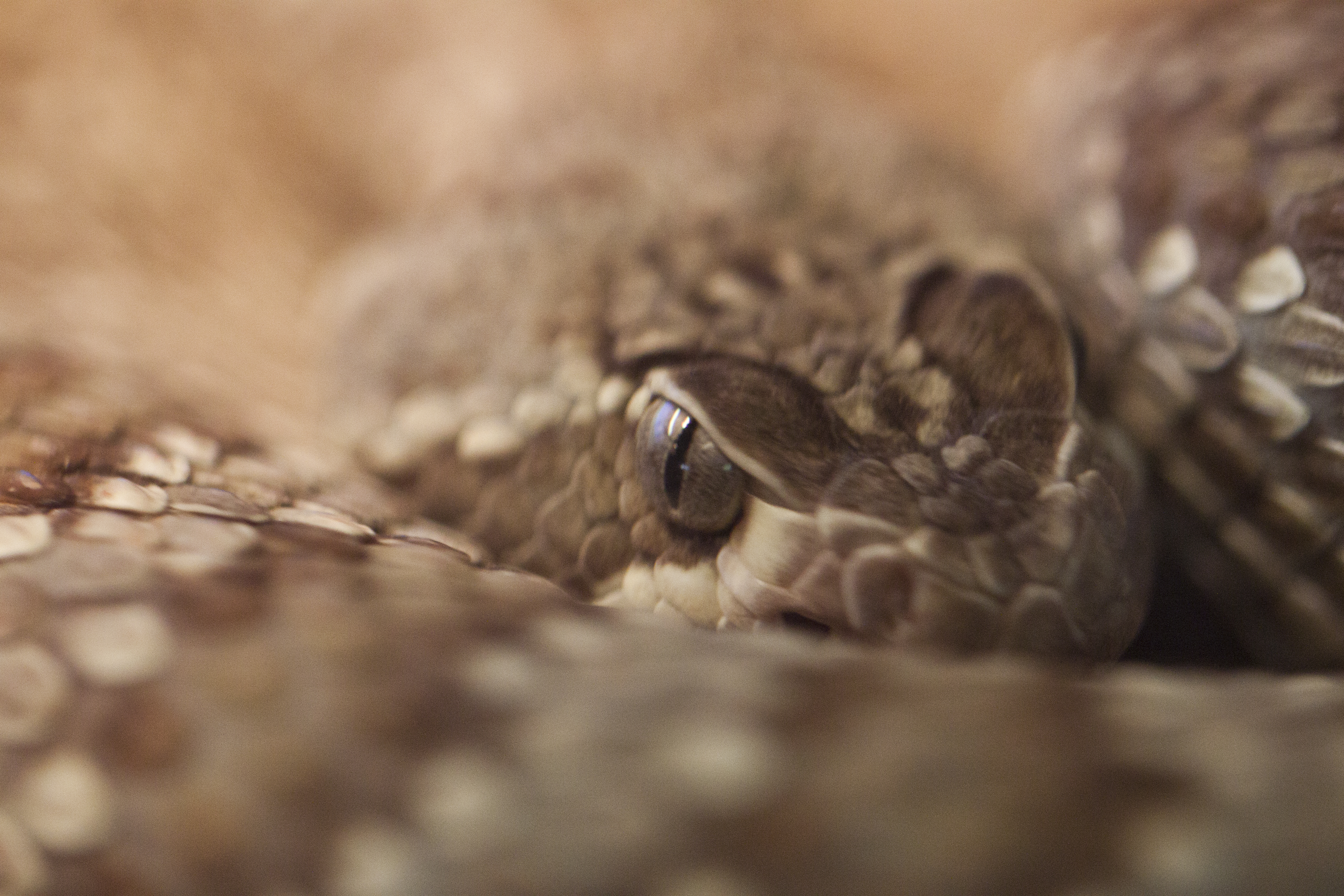 The head of a coiled Western Diamondback Rattlesnake