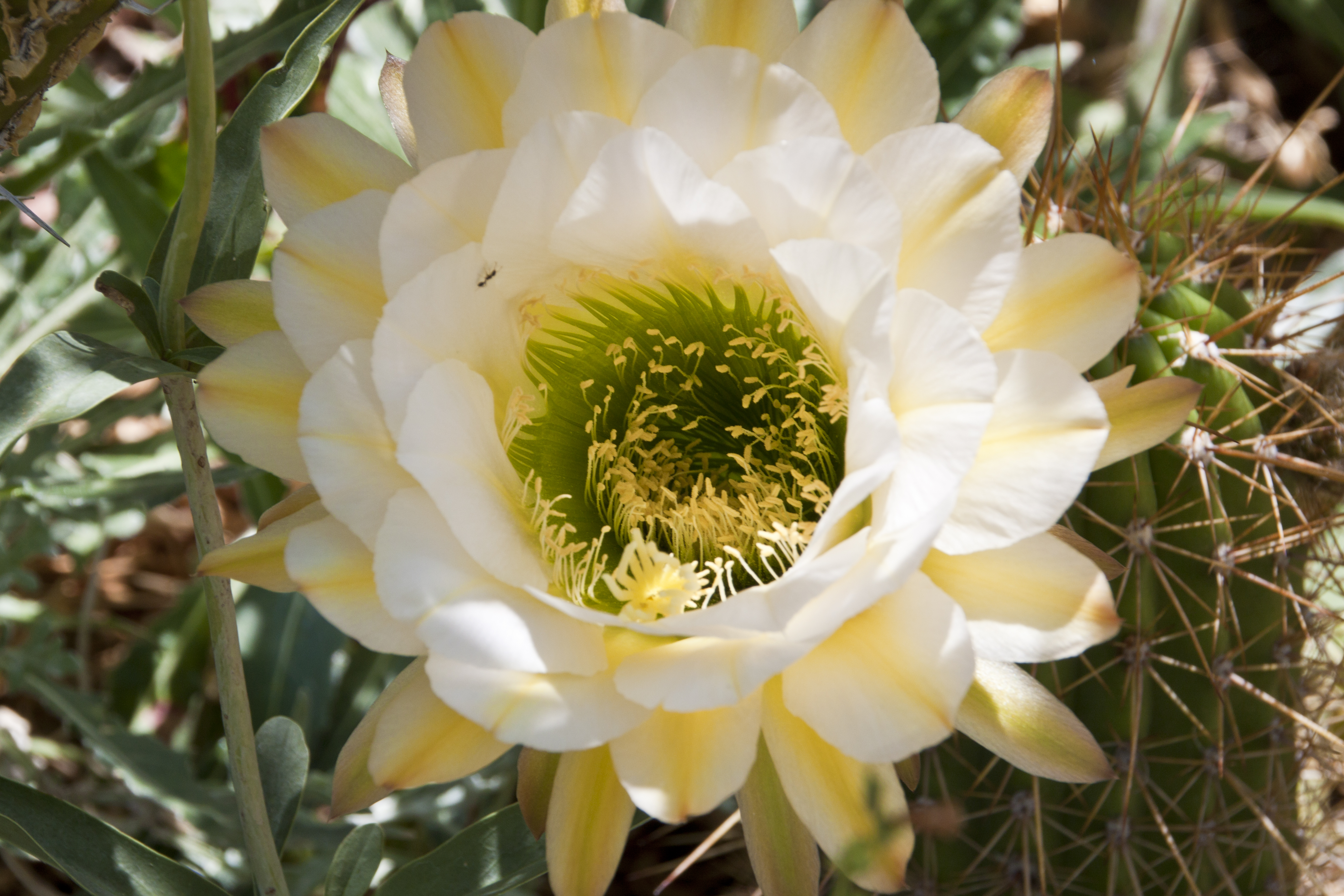 Yellow-white Torch Cactus flower with visiting ant