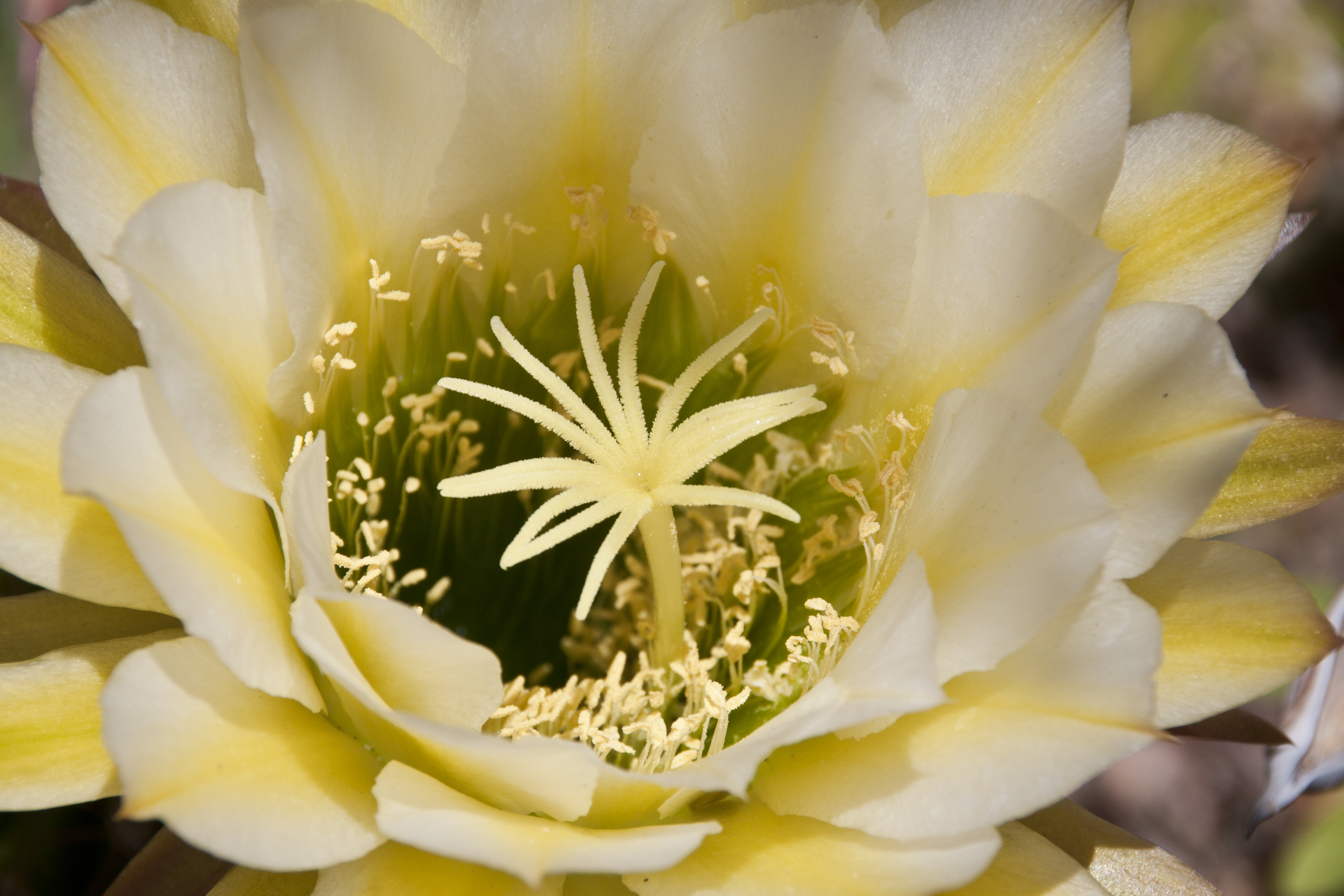Stamens in the center of a yellow-white Torch Cactus flower