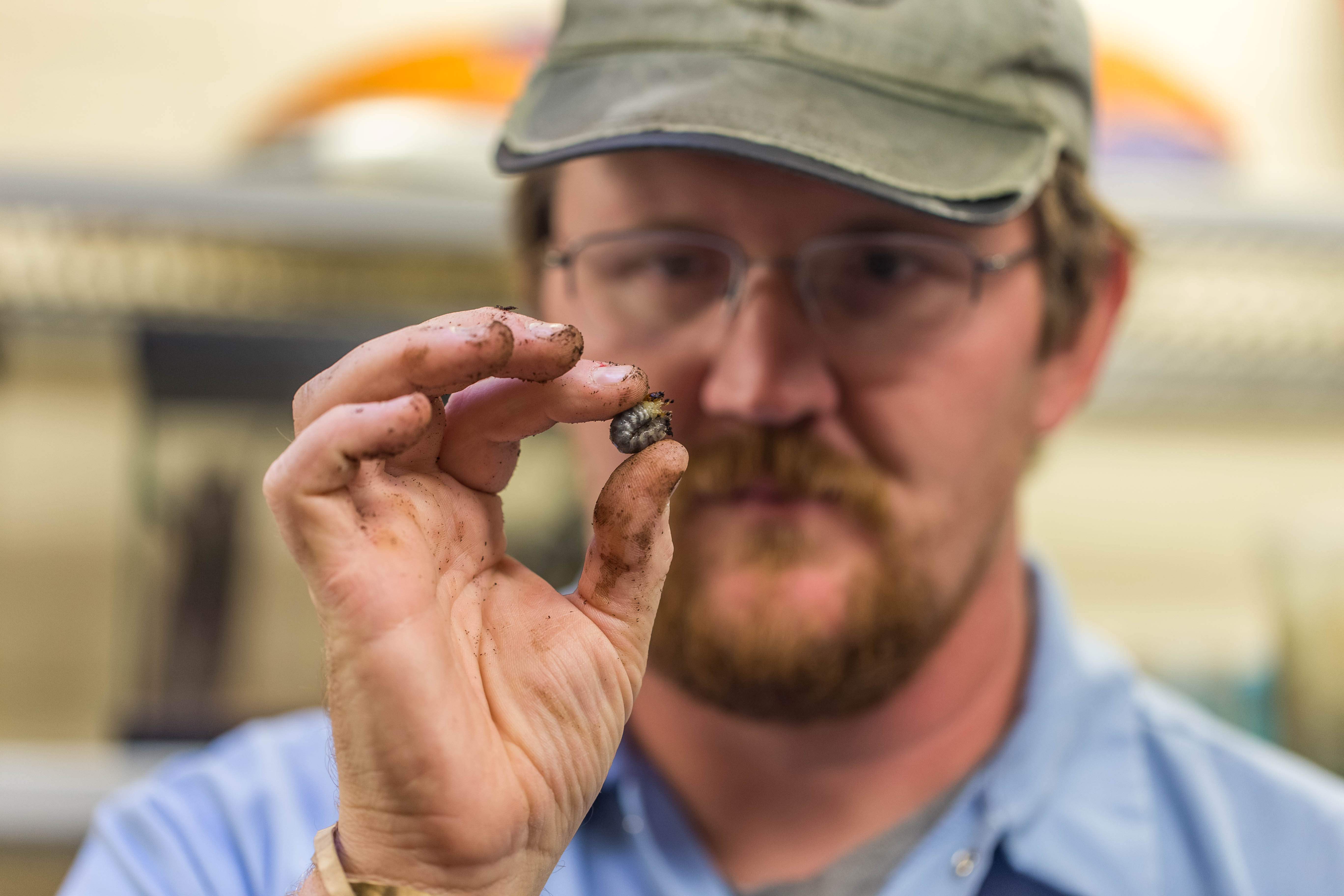 Tony Palmer, HIIZ Keeper at the Arizona-Sonora Desert Museum, holds up a stag Beetle larva