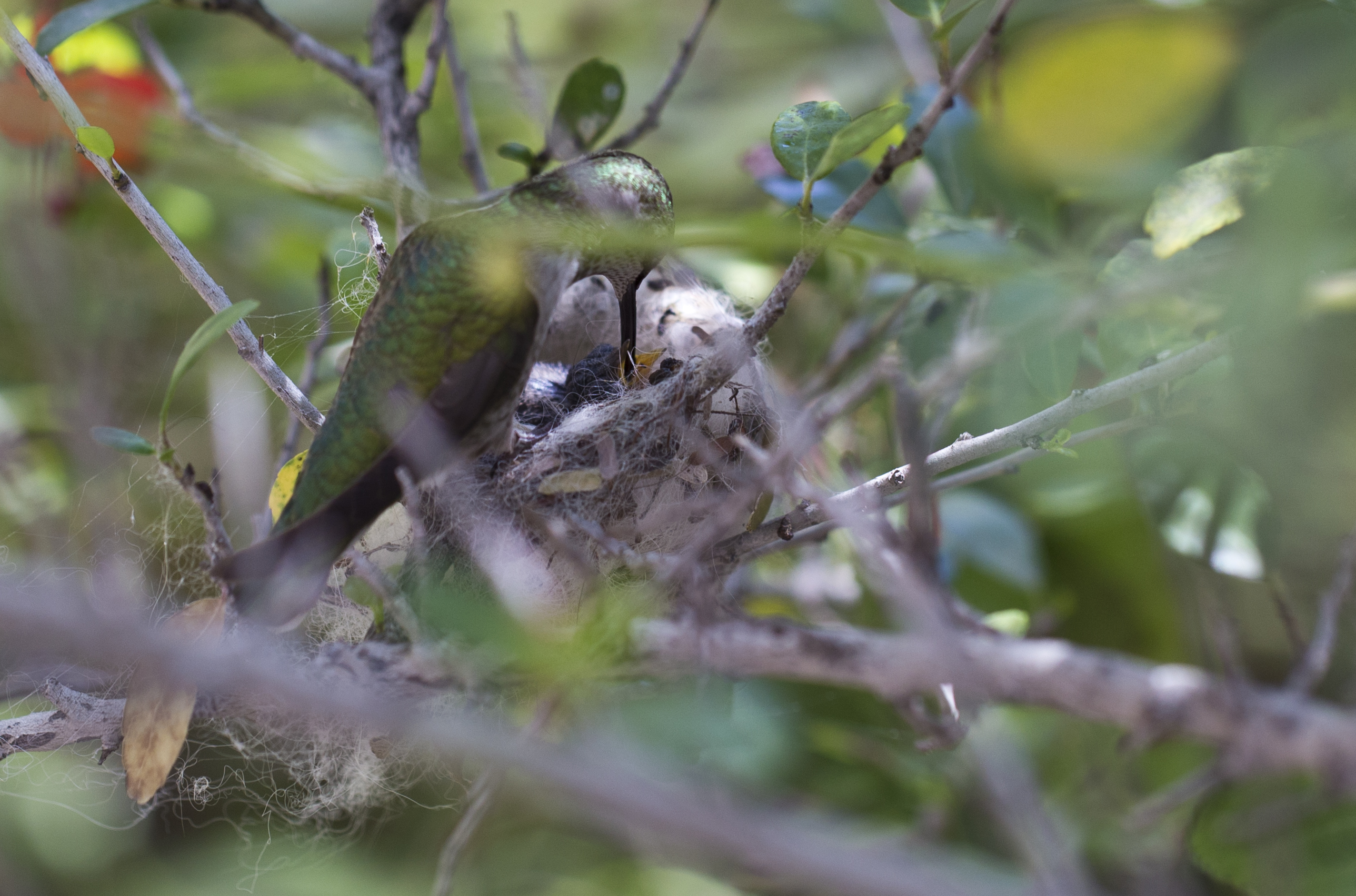 Hummingbird chick being fed in the nest