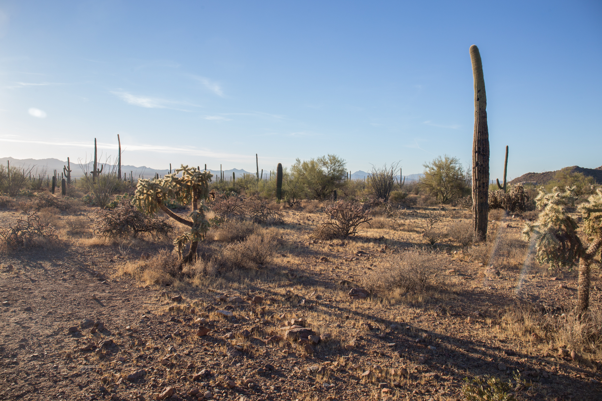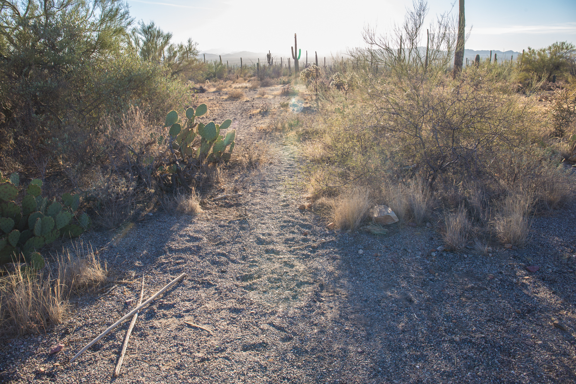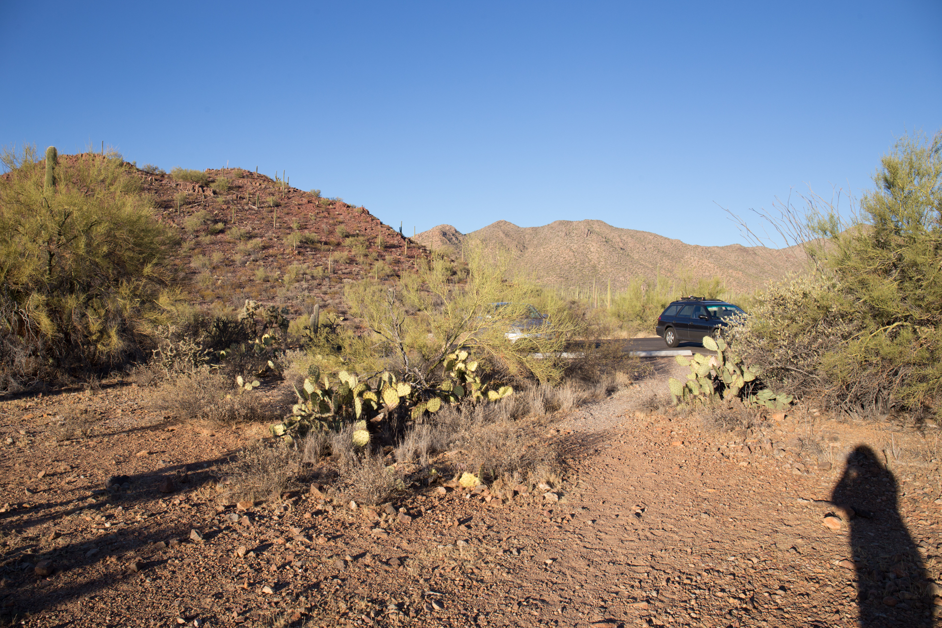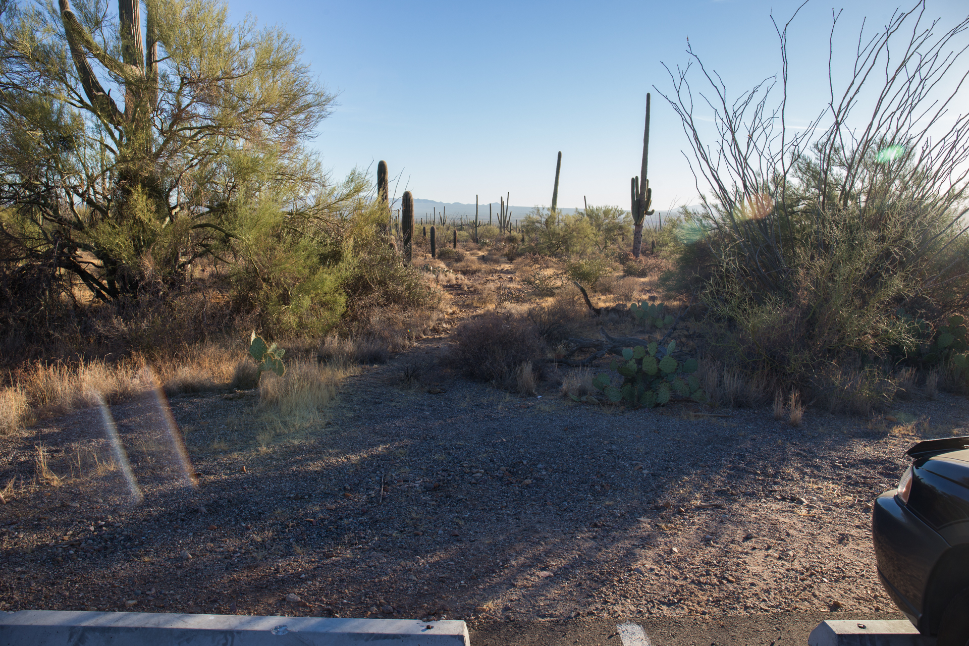 There are plenty of places to pull over on Sandario, south of Manville Road, where the boundary of SNP lies. However, there are few actual trails into the desert. Views to the west are good.