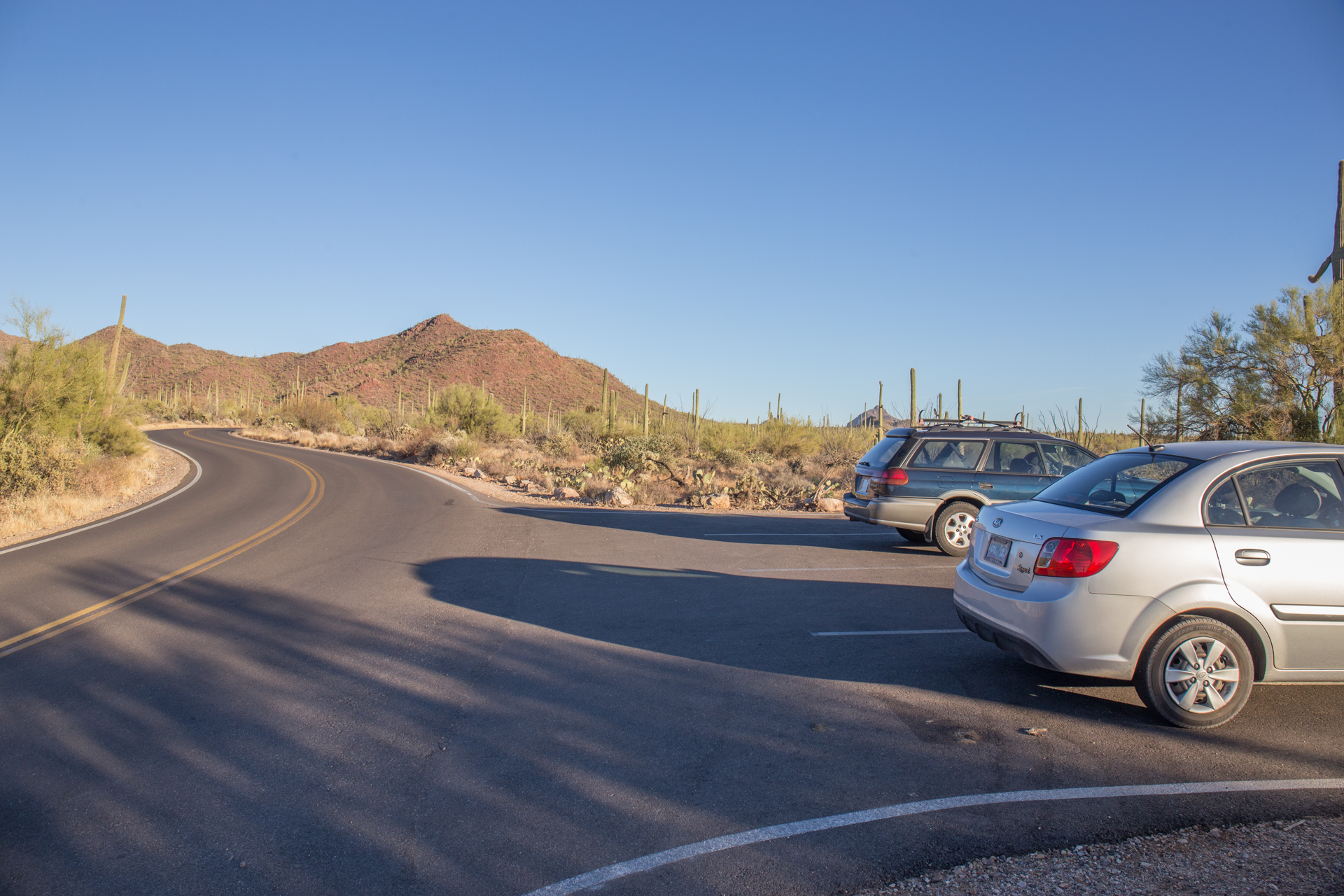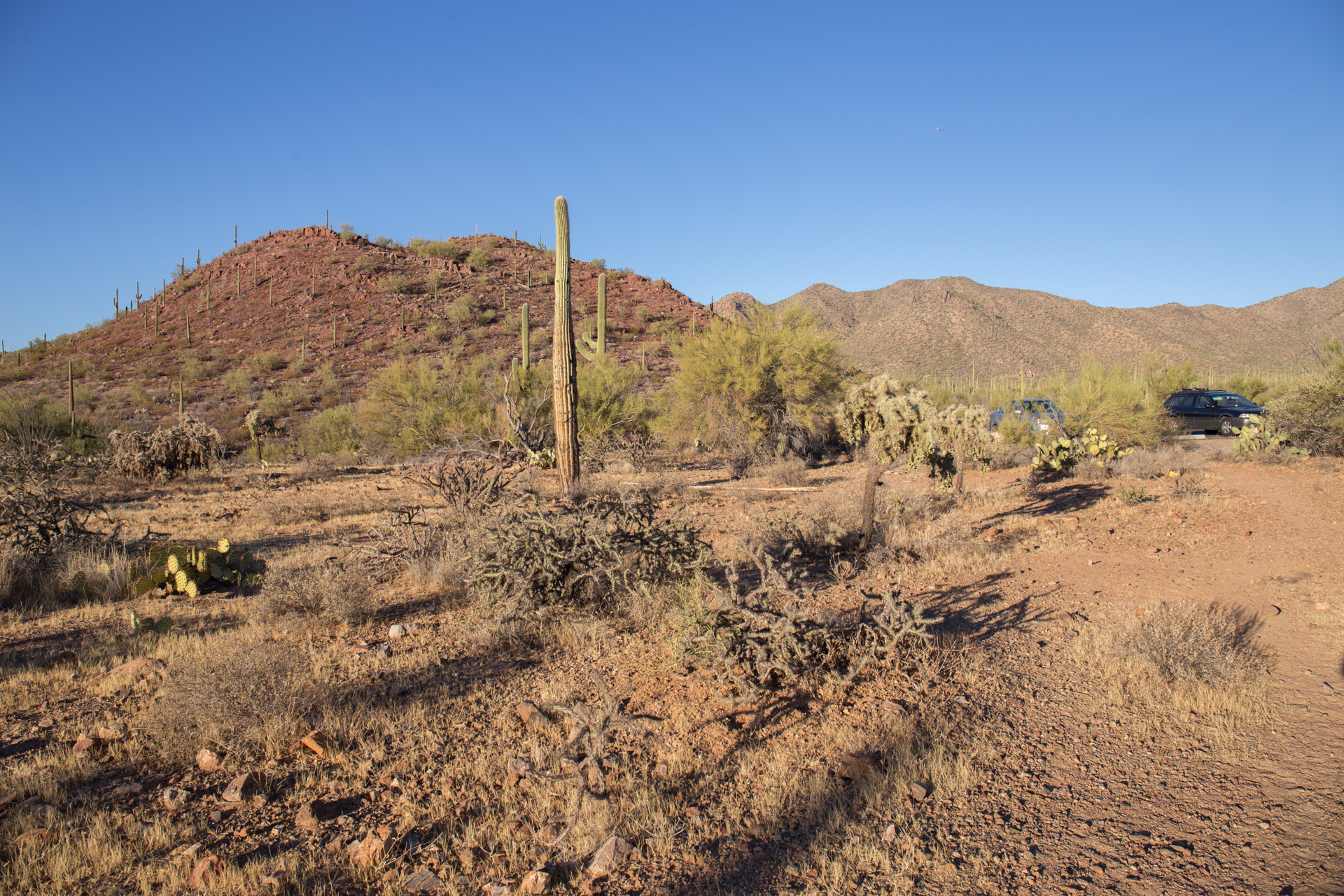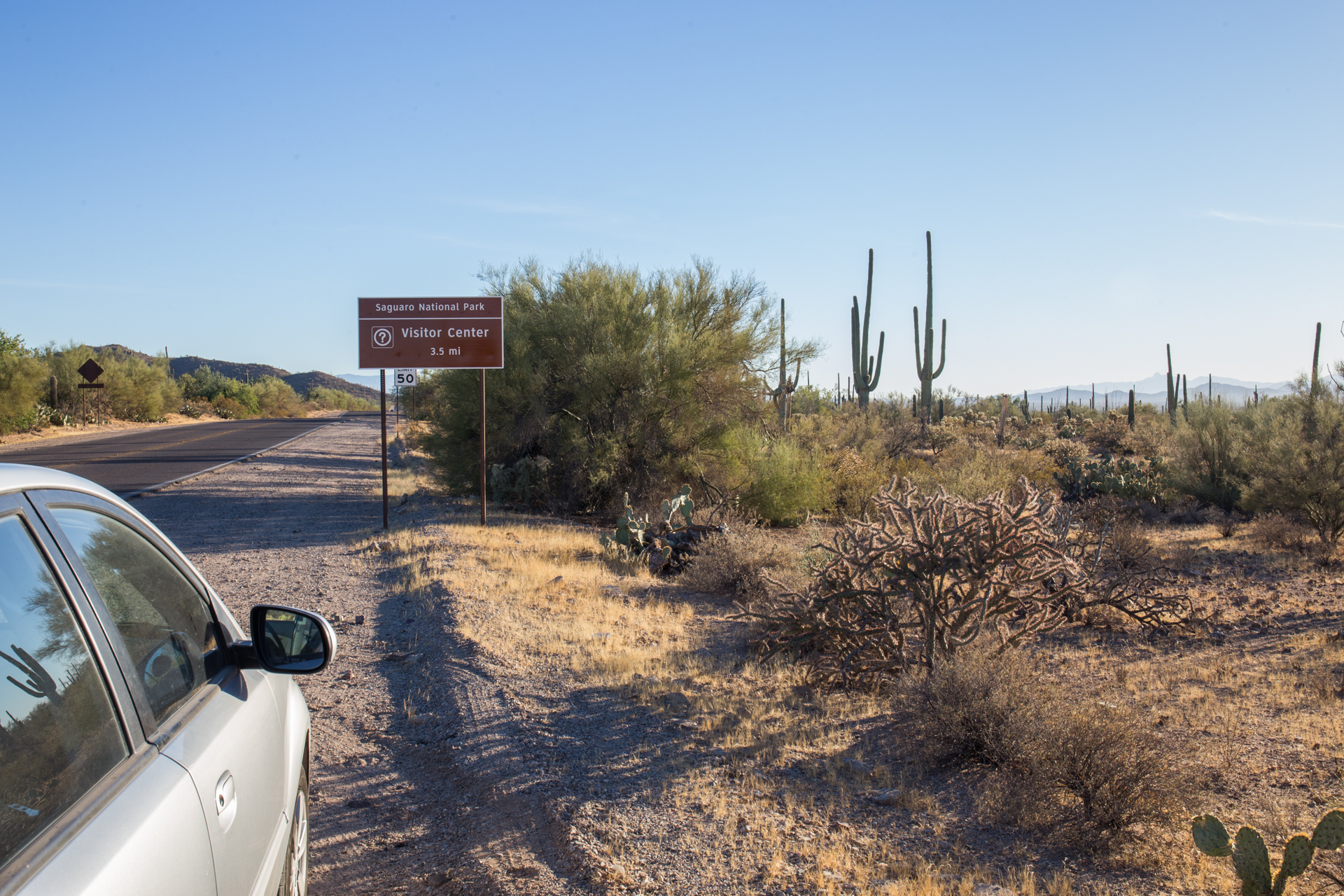 There are plenty of places to pull over on Sandario, south of Manville Road, where the boundary of SNP lies. However, there are few actual trails into the desert. Views to the west are good.