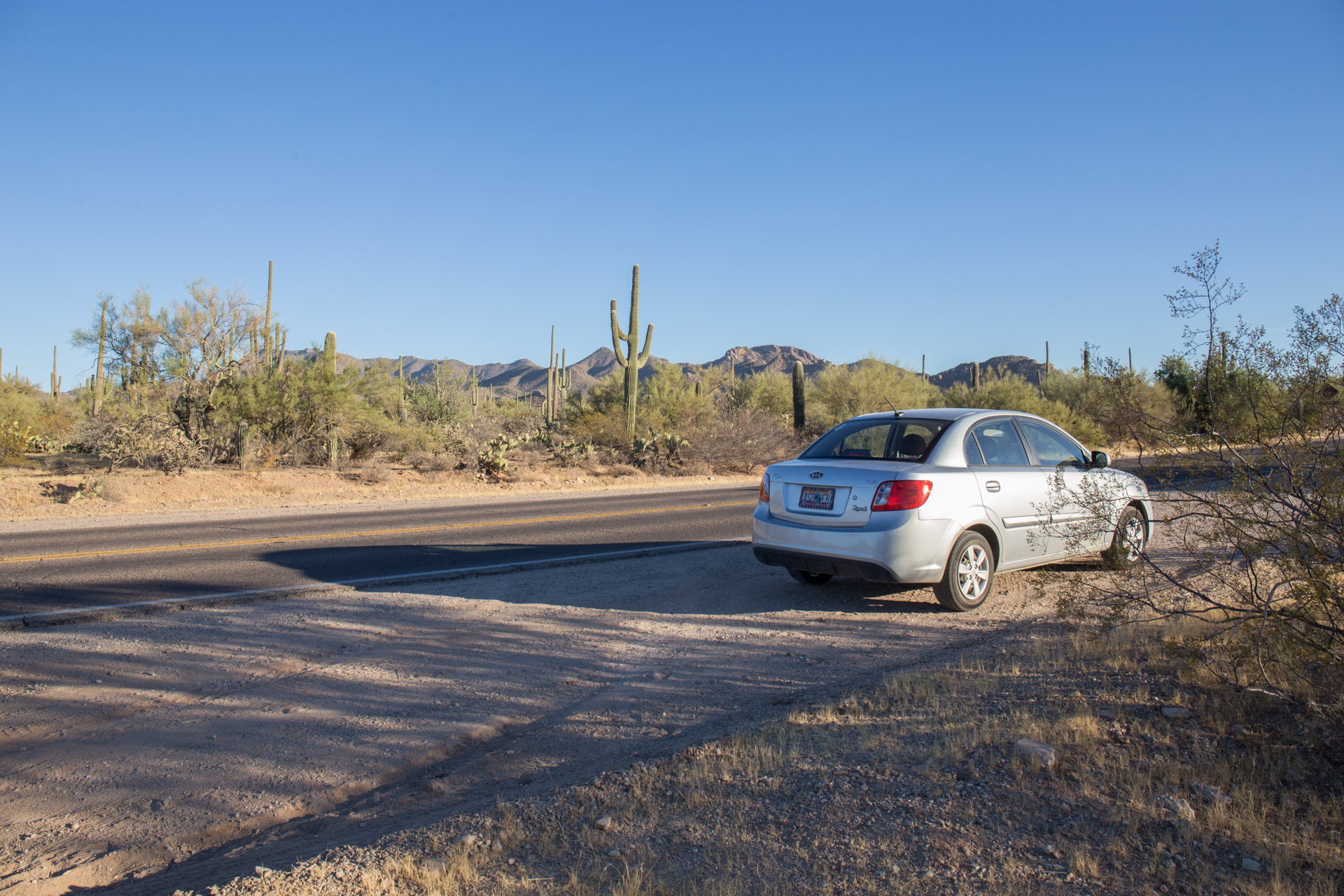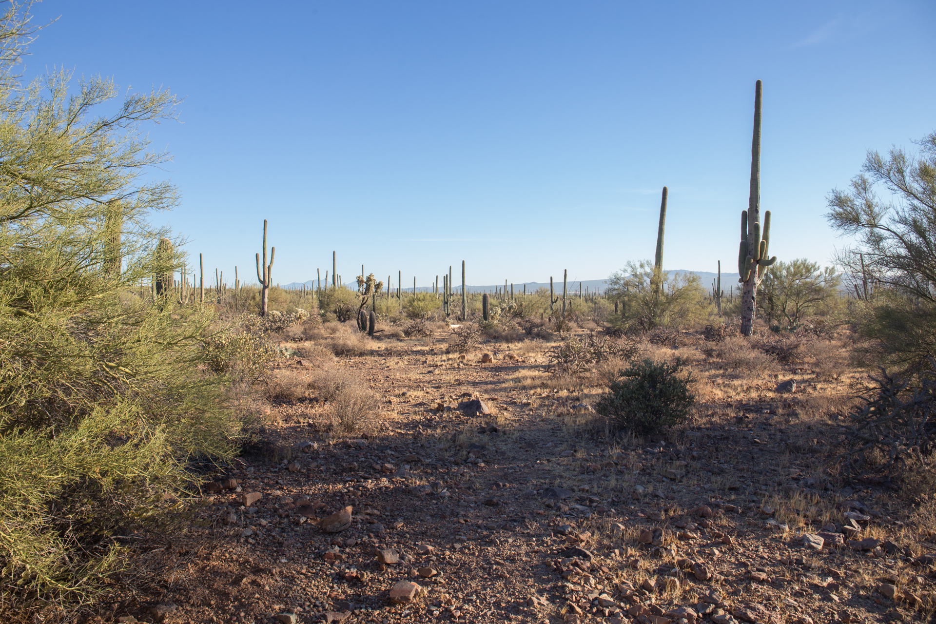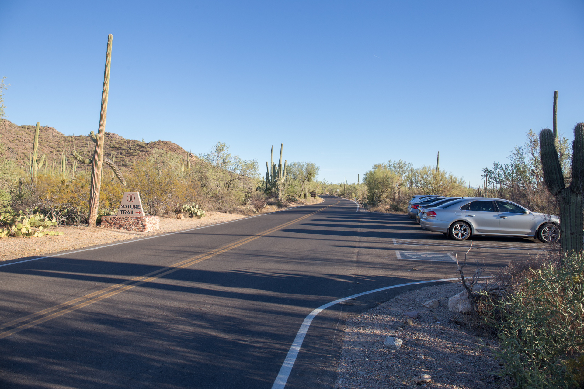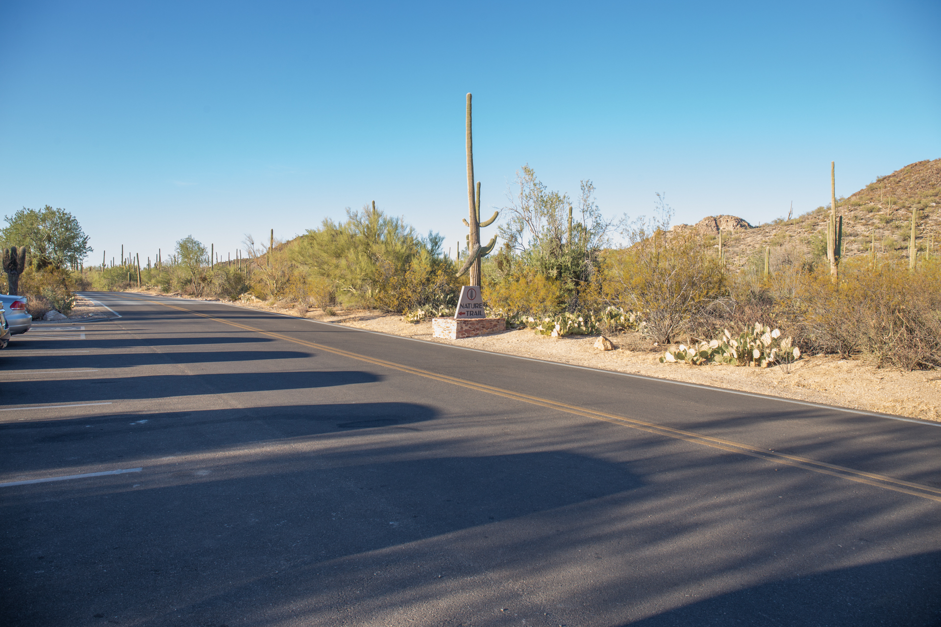 There are plenty of places to pull over on Sandario, south of Manville Road, where the boundary of SNP lies. However, there are few actual trails into the desert. Views to the west are good.
